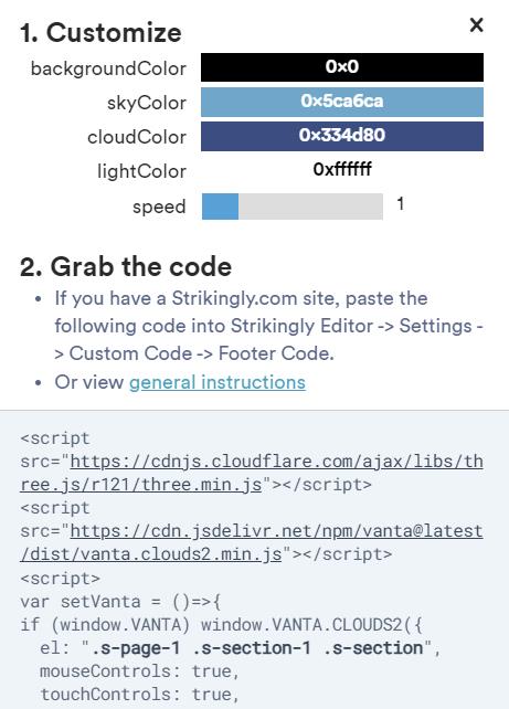 }Vanta 中 cloud 效果有多个颜色可以指定。对视觉效果影响最大的应该是天空颜色(skyColor)。使用上面的插值函数,可以得到如下的代码: